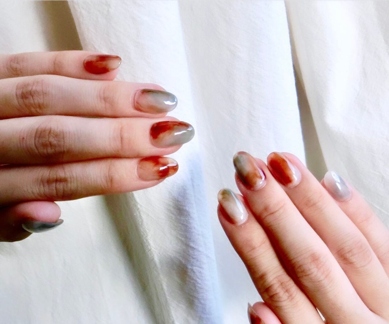 白濁したブルーとクリアな茶系が、クールだけど優しいお色になります。